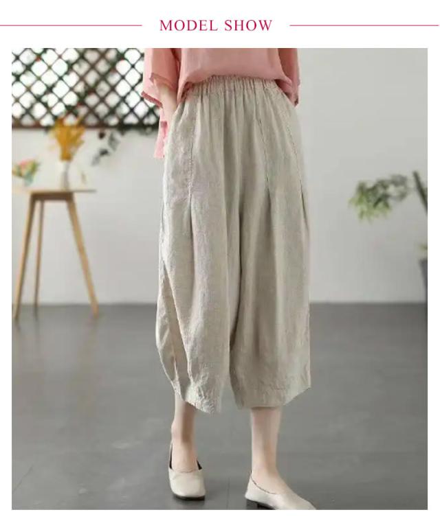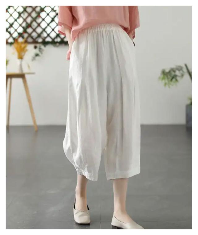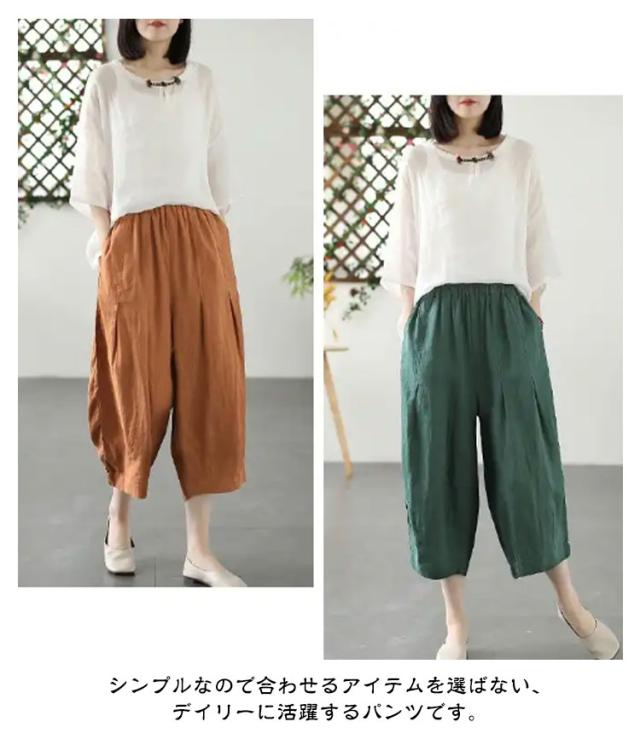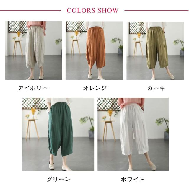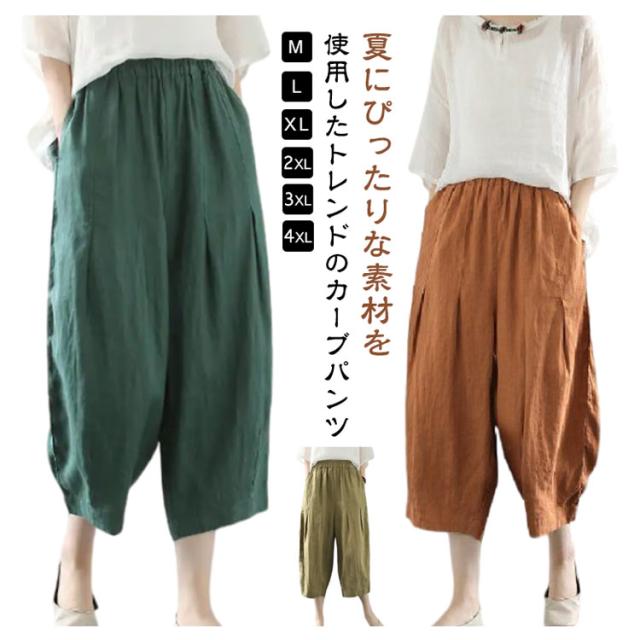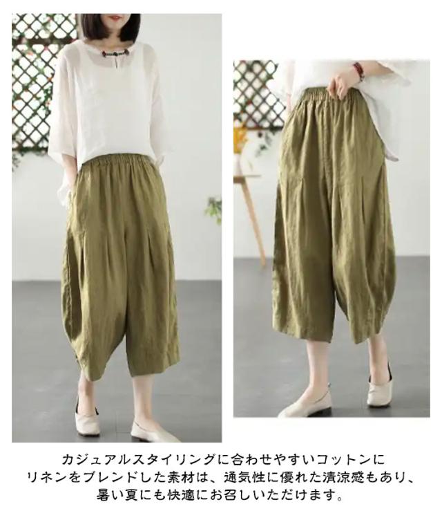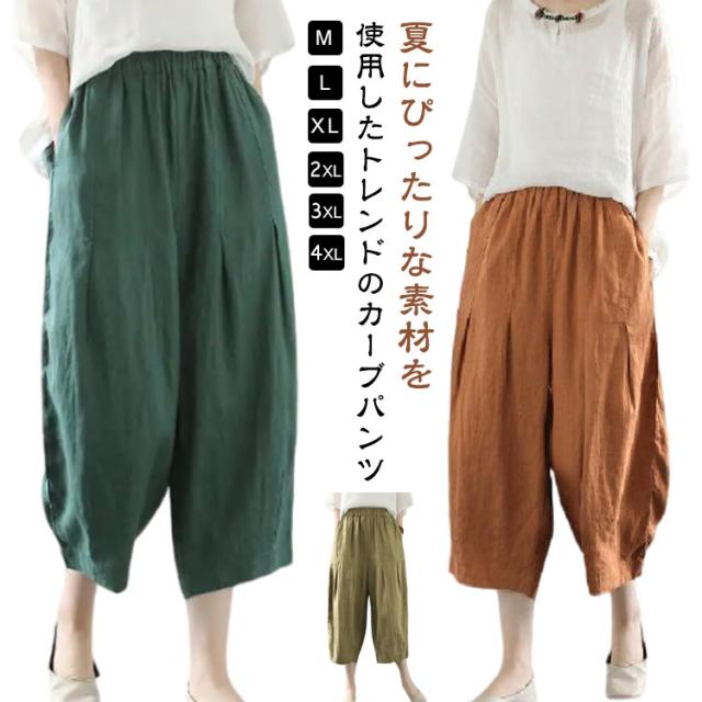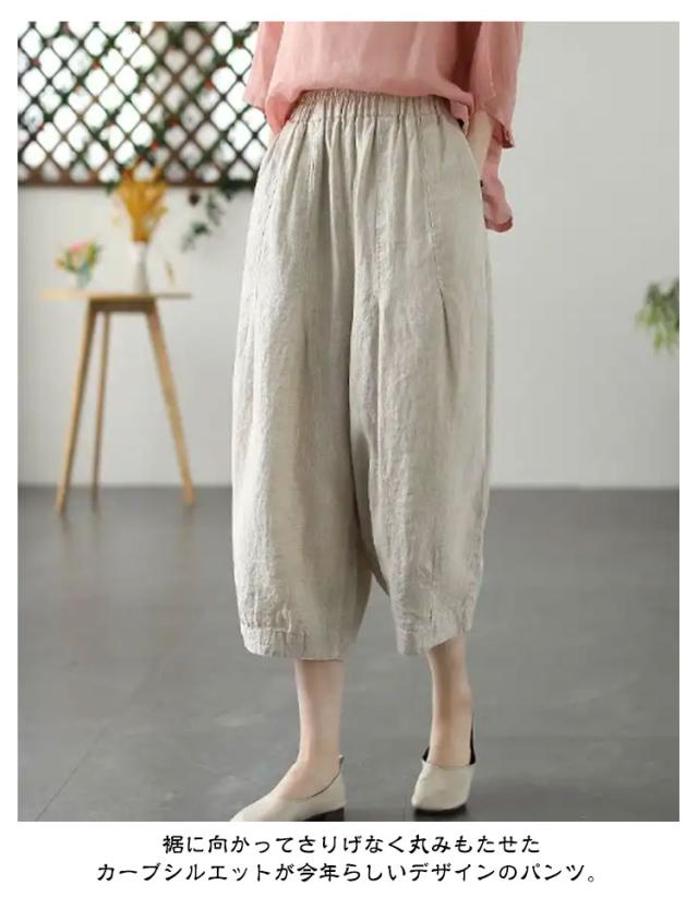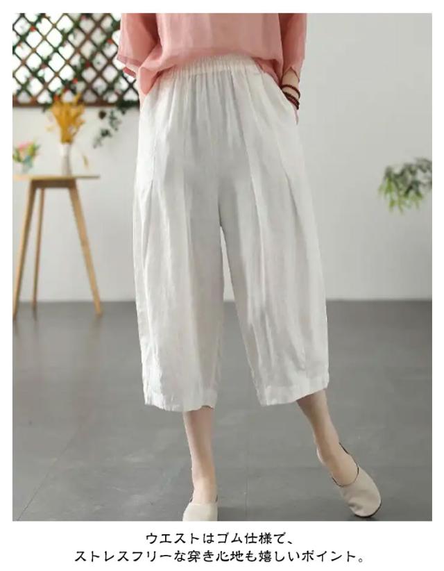 リネンパンツ ワイド カーブパンツ 7分丈 低身長 レディース コクーンパンツ ワイドパンツ カーブ タック入り 春 夏 ボトム パンツ リネン 綿麻 ナチュラル 薄手 通気性 清涼感 軽量 ゆったり 体型カバー ゴムウエスト ポケット付き 大人 カジュアル シンプル 白 【送無】