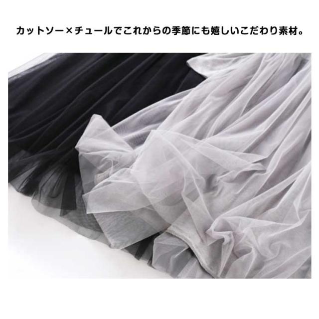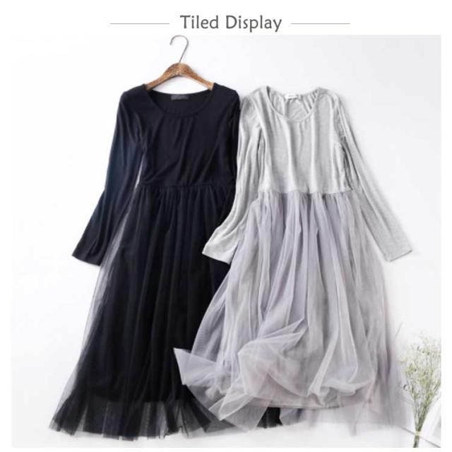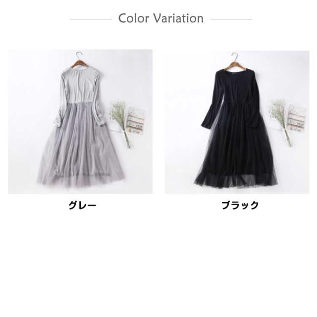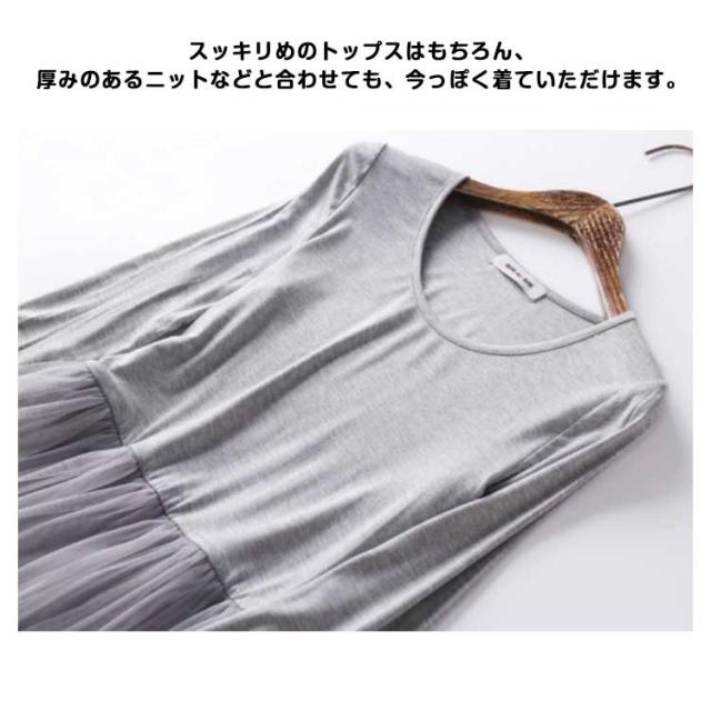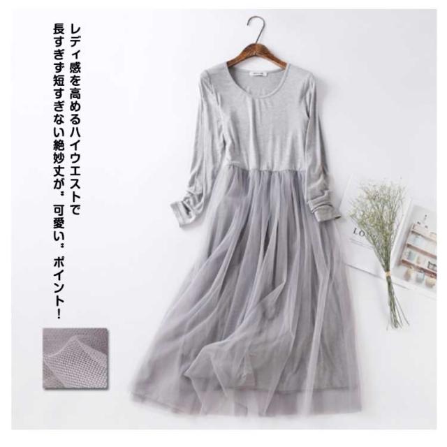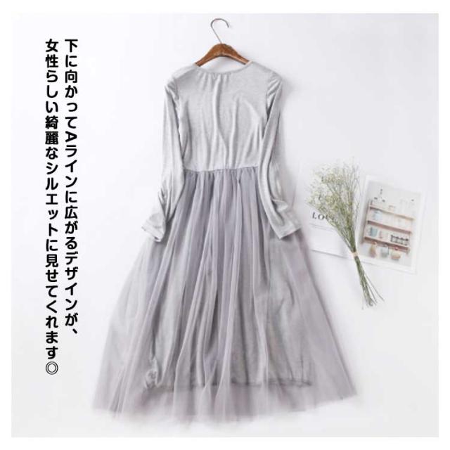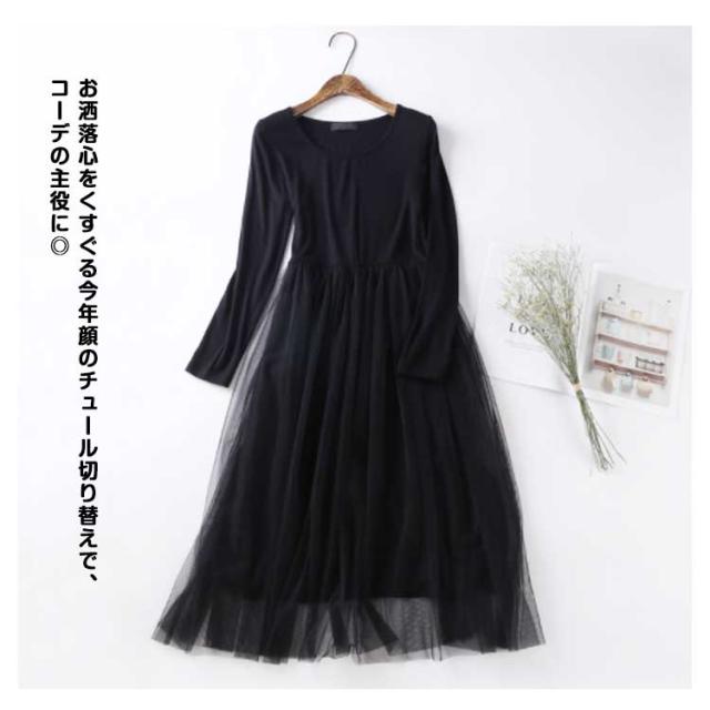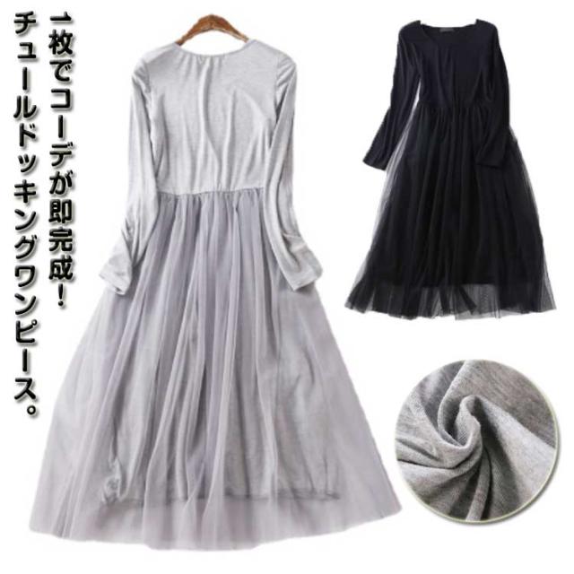 チュール ドッキングワンピース 長袖 チュールワンピース 切り替え ワンピース 異素材 重ね着 aライン ロング丈 春 秋 冬 送料無料
