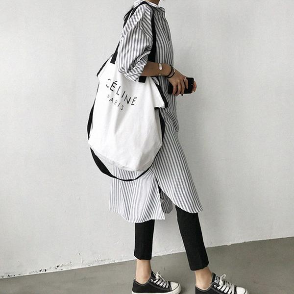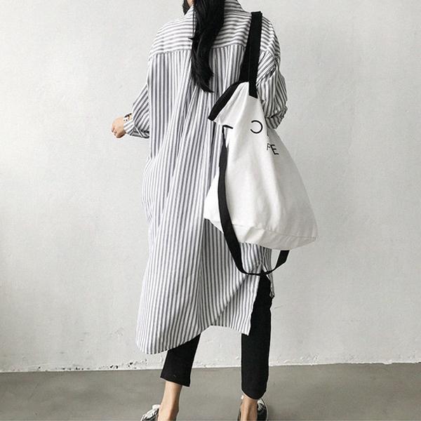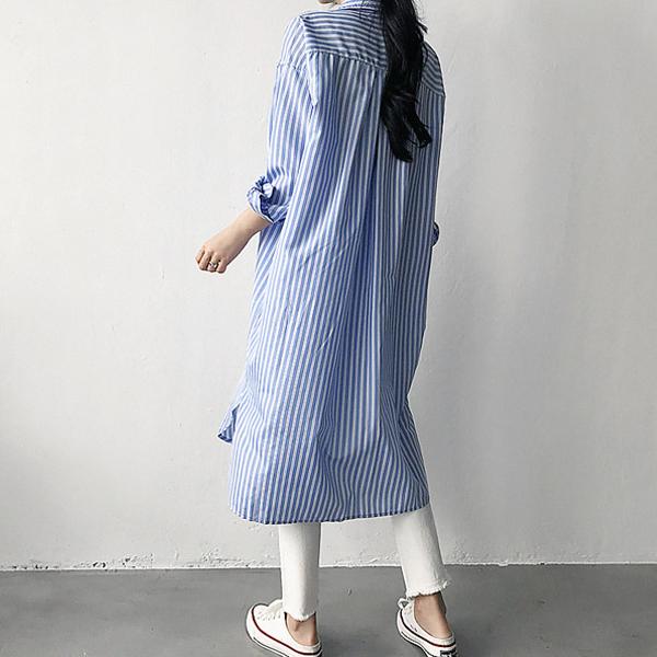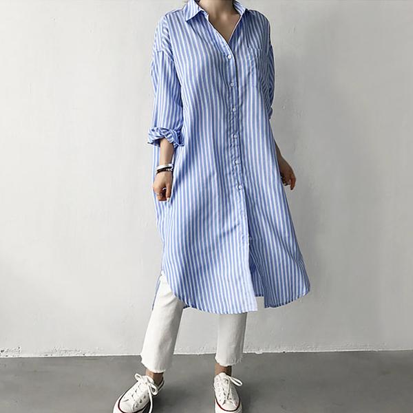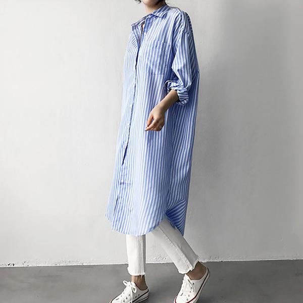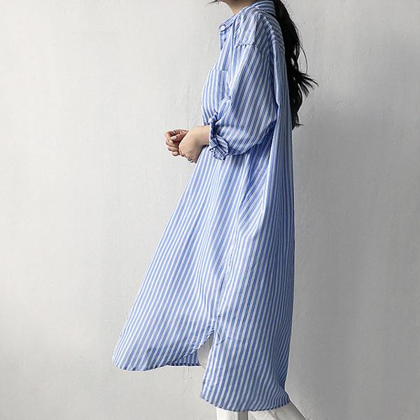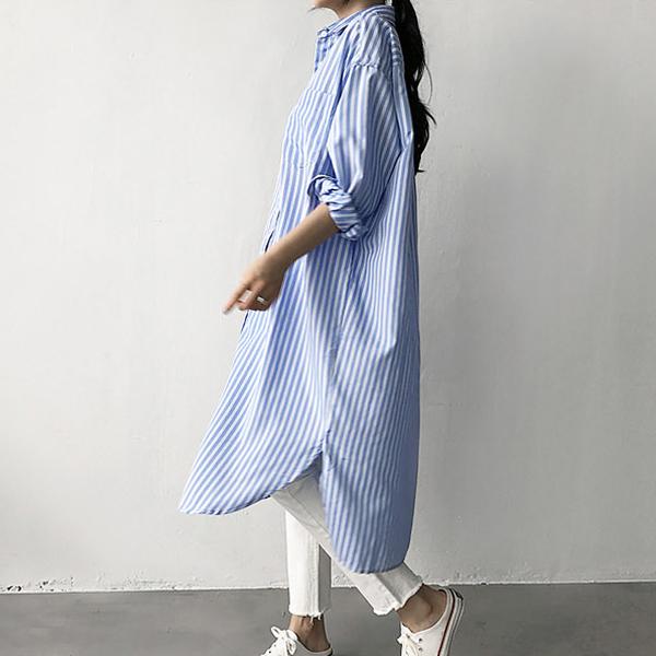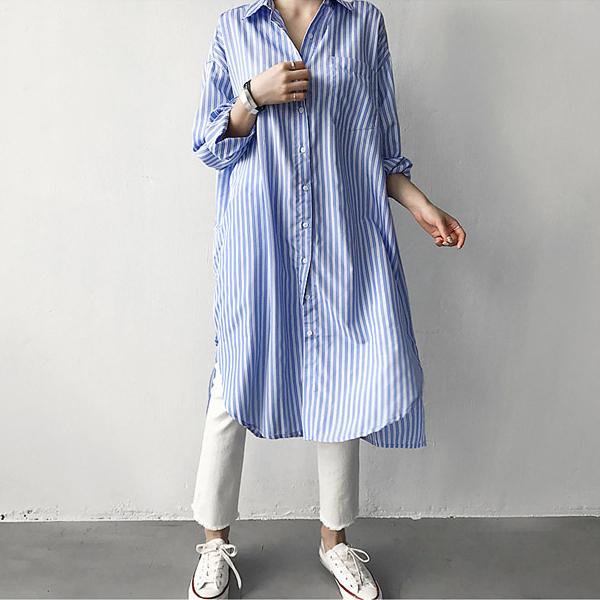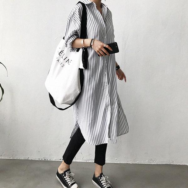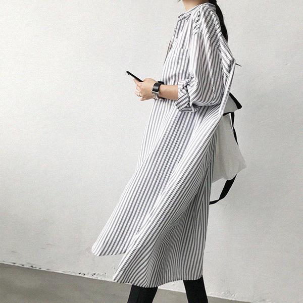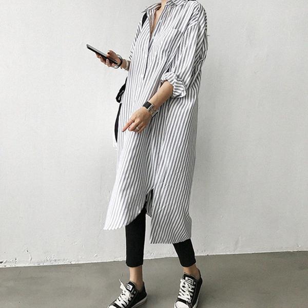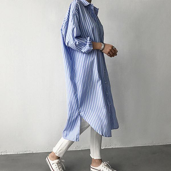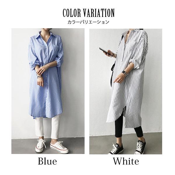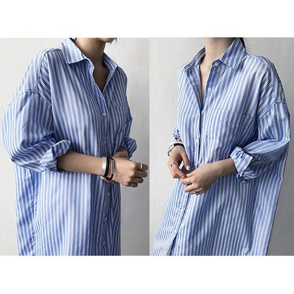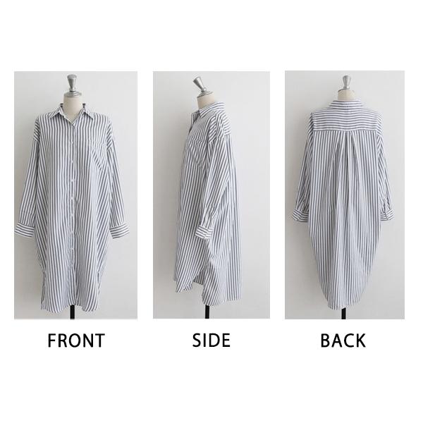 ロングシャツワンピース トップス ワンピース ストライプ 長袖 膝丈ワンピ シャツワンピ ストライプワンピ送料無料