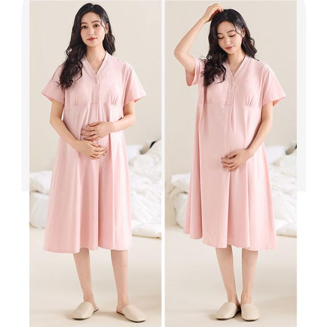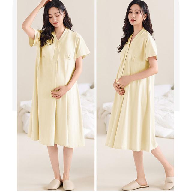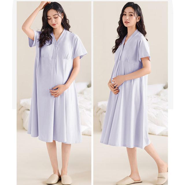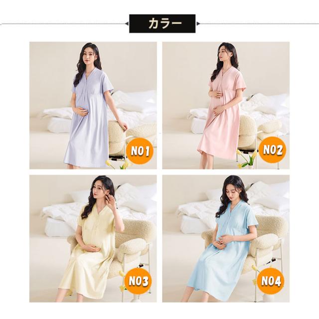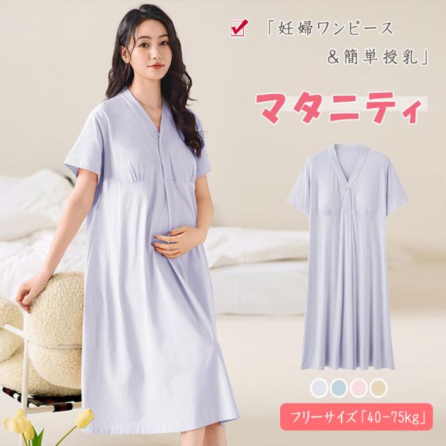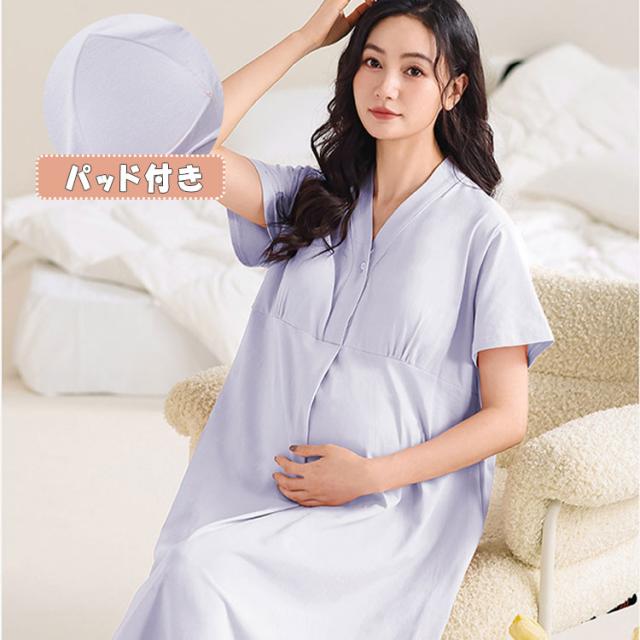 マタニティ パジャマ ワンピース 授乳服 授乳パジャマ マタニティパジャマワンピース 半袖 膝下丈 ミディ丈 吸湿性 放湿性 フロントボタン カシュクールオープン 簡単授乳 パッド付 ゆったり 柔らか 優しい肌触り 産前 産後 授乳期 妊婦服