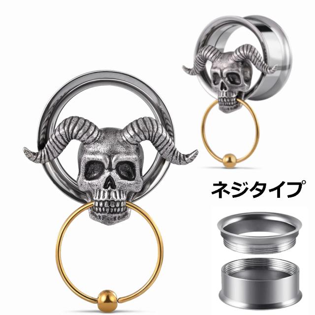 ネジタイプのダブルフレアの中に立体的な金色のキャプティブビーズリングを口にくわえたサタンの山羊の角をつけたドクロをデザインした不気味なホール系ボディピアス。