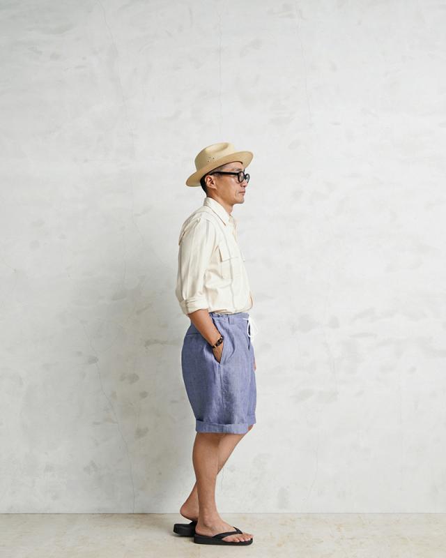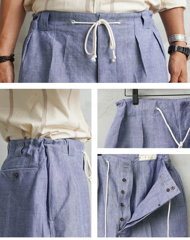 フランス海軍より「FRENCH NAVY LINEN SHORTS」という名称で知られる1950〜60年代という古い年代のヴィンテージアイテムに、ウエストゴムとドローコードをプラスしベルトレスで履けるイージーパンツに仕上げました。ヴィンテージ特有の質感と年代の古さを感じさせるネップ感のある素材感、中肉厚のリネンが穿き心地良く、通気性に優れています。