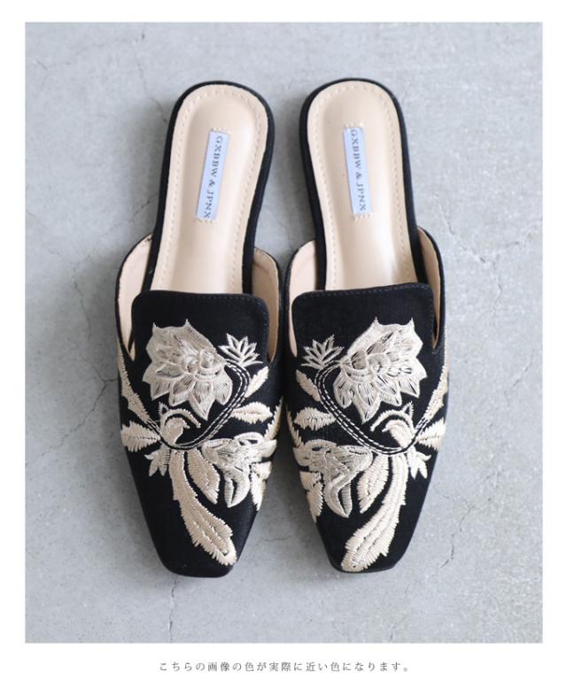(黒)エレガントな花刺繍のバブーシュミュール cawaii w60863ps 35~39対応 ぺたんこ 低ヒール スクエア フラット ブラック エレガント オシャレ 大人可愛い 上品 日常使い ヘビロテ おでかけ 春 夏 秋 レディース ファッション ミセス 30代 40代 50代