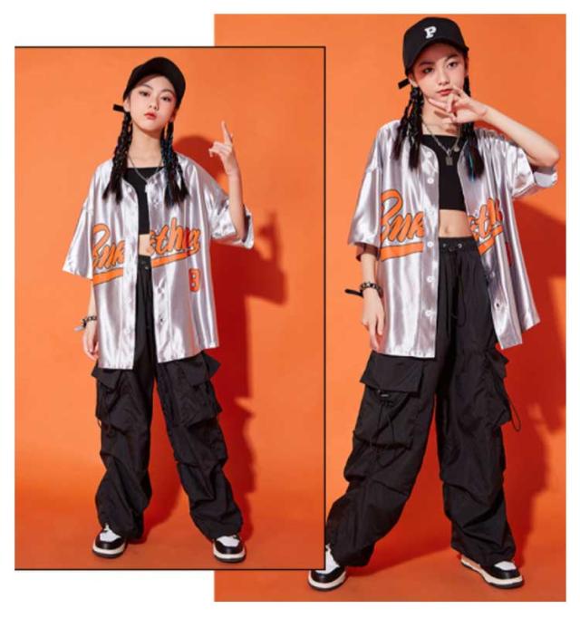 3点セット 演出服 シャツジャケット ダンス衣装 キッズ 女の子 セットアップ 夏用 カジュアルスーツ ワイドパンツ 男の子 シルバー 舞台服 カーゴパンツ ロング丈 練習着 ストリート系 ジャズダンス かっこいい 普段着 子供服 110−180cm