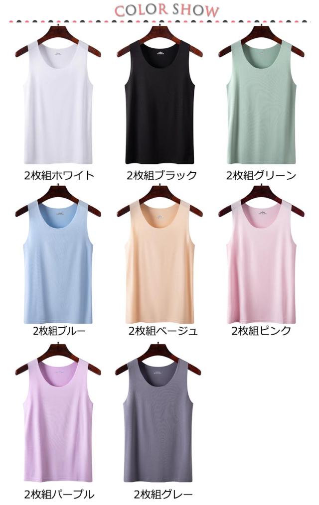 | 全8色x6サイズ 2枚組/接触冷感&吸水速乾シームレスインナータンクトップ アウターに響かず、心地よい肌ざわりが魅力のシームレス仕様 さらに、接触冷感仕様なので着る瞬間から涼しさを感じ 汗を瞬時に吸収・拡散し、快適な着心地をキープ | |