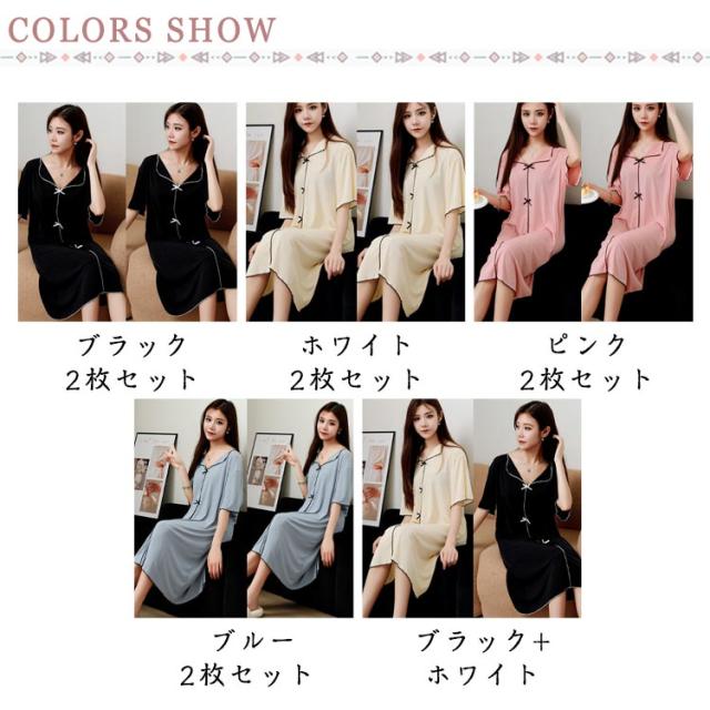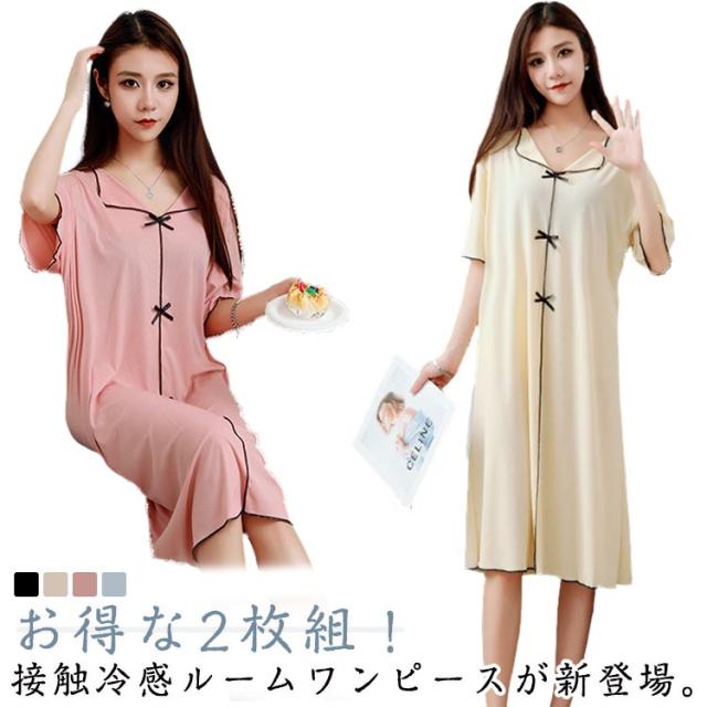 ゆったり 涼感 ルームウェア 半袖 2枚セット 涼しい 接触冷感 シンプル 2枚セット パジャマ 薄手 リボン 部屋着 ルームワンピース 可愛い 無地 涼しい 無地 大きいサイズ