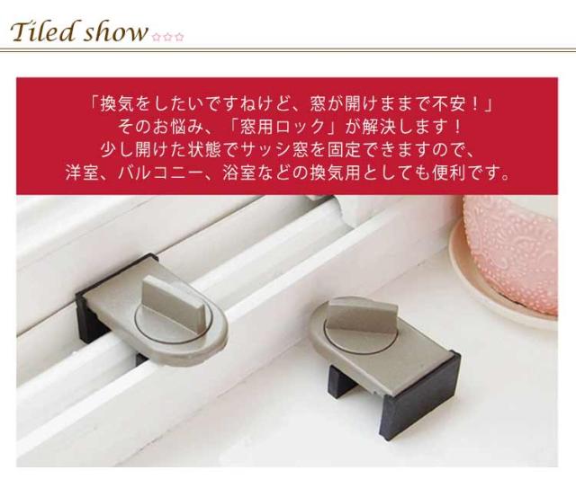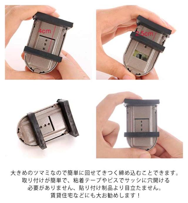 | 窓にしっかりはさんでロック! 穴を開けずに簡単取付窓用補助錠 「換気をしたいですねけど、窓が開けままで不安!」そのお悩み、「窓用ロック」が解決します!少し開けた状態でサッシ窓を固定できますので、洋室、バルコニー、浴室などの換気用としても便利です。窓を開けたまま風を通すことで、泥棒や窃盗者の侵入も防ぎます。空き巣やひとり暮らしの女性、ペットや小さなお子さまのいるお宅の安全対策に大おすすめです! 赤ちゃんが窓からの転落、指はさみ防止や犬猫等ペットの逃走や迷子を防ぐことができます。防犯効果を高めるため、上下2箇所に取付けることをお薦め致します。2個セットなので複数の窓にも設置できます。 アルミニウム合金+ゴムを採用しており、窓に傷つきにくく、耐衝撃性、耐久性があるの窓ストッパー。ほとんどのプッシュ型窓のサイズは共通です。 大きめのツマミなので簡単に回せてきつく締め込むことできます。取り付けが簡単で、粘着テープやビスでサッシに穴開ける必要がありません、貼り付け制品より目立たません。賃貸住宅などにも大お勧めします! | |