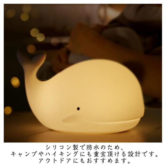 | かわいいくじら型のシリコンライト。【タッチ式】【2段階調光】 可愛いくじら型のナイトライトで、お子様に暖かく快適な夜を過ごさせてあげましょう。部屋の雰囲気やムードに合わせて、簡単に光を調整することができます。 ナイトライトは有害な成分が一切含まない子供用安全シリコンを採用して、触り心地も良く、無害で安全です。マシュマロのように柔らかくて破損しにくい、角のないデザインで、ぶつかったり、投げたりしても割れず、破片で怪我を負う心配もありません。 やらわかくプニプニした手触りが創造的でストレス解消にも。ぶつけても凹むだけですぐ元通りになます。癒し効果も抜群です。子供からお年寄りまで、全年齢対象が安心して使用できます。 手乗りサイズの可愛いくじら型ナイトライトは点灯させても熱くならなくて、子供が遊んでも100%安心です。手元ライトを持ってので、子供たちは夜中のトイレに一人で行けますよ。 授乳ライトとして、母や赤ちゃん、子供にもっと配慮を与えます。大人も楽しくなってしまうライトで授乳時間も癒されそうですね。授乳の時も優しい明り!間接照明で子供の目にも安心です。優しい光で赤ちゃんの目が覚めないので、夜中の赤ちゃんのお世話に大変重宝、夜間授乳・おむつ替えにも役に立ちます。 1200mAhバッテリーを内蔵し、USBケーブルで充電式、消費電力少なく、省エネなベッドサイドランプです。約8-10H継続してご利用いただけます。 コンパクトで持ち運びに便利。 シリコン製で防水のため、キャンプやハイキングにも重宝頂ける設計です。アウトドアにもおすすめます。災害時には、懐中電灯の代わりに、防災用具としても幅広く大活躍に使えます。出産祝い、結婚祝い、家族や友たちへの誕生日プレゼントにもお勧めです。 | |