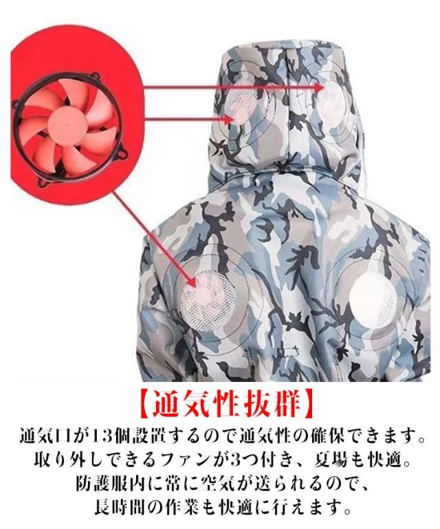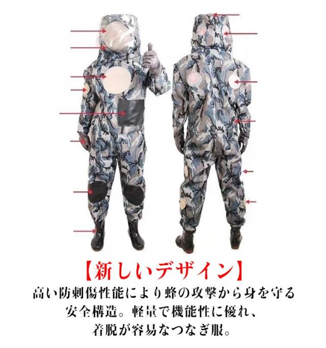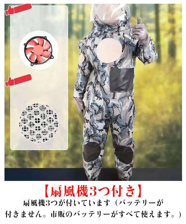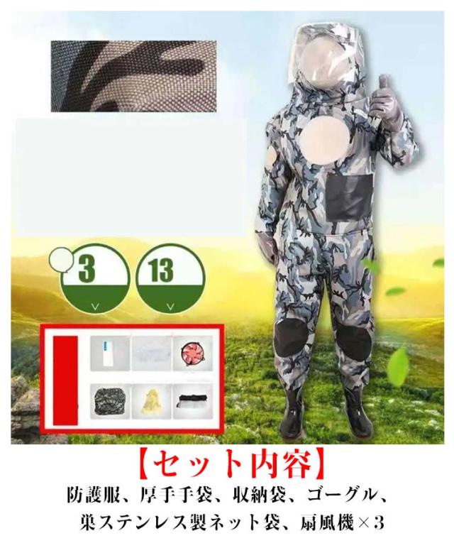| 【新しいデザイン】すずめ蜂から身を守る最強防護服です。高い防刺傷性能により蜂の攻撃から身を守る安全構造。軽量で機能性に優れ、着脱が容易なつなぎ服。 【扇風機3つ付き】扇風機3つが付いています(バッテリーが付きません。市販のバッテリーがすべて使えます。) 【素材】厚手オックスフォード布。蒸し暑くない、着心地良く洗濯もしやすい。安全な服の厚みと通気性を確保。 【通気性抜群】通気口が13個設置するので通気性の確保できます。取り外しできるファンが3つ付き、夏場も快適。防護服内に常に空気が送られるので、長時間の作業も快適に行えます。 【セット内容】防護服、厚手手袋、収納袋、ゴーグル、巣ステンレス製ネット袋、扇風機×3 | |