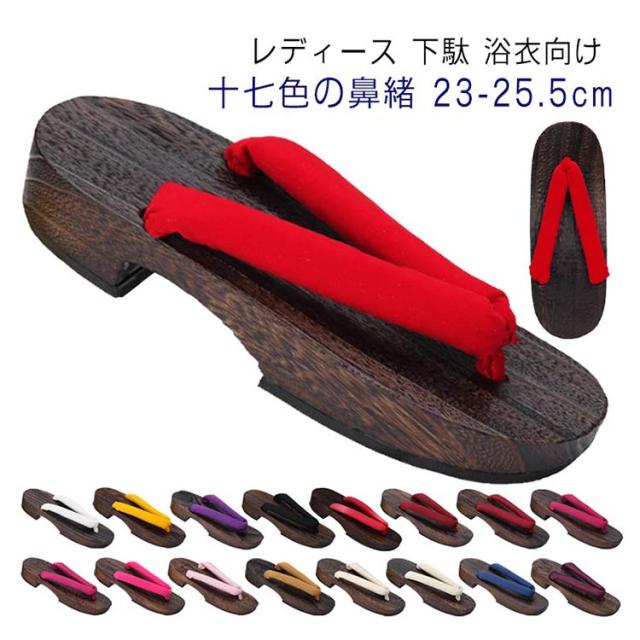 | レディース 下駄 浴衣向け 十七色の鼻緒 23-25.5cm 台には軽量で歩きやすく、美しい黒焼きの桐を使用しています 夏祭りや花火大会の浴衣や、カジュアルな夏着物によくお似合いです | |