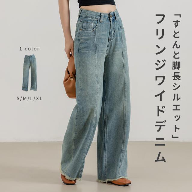 夏新作「美脚見せならワイドがBEST」デニム パンツ ゆったり レディース ボトムス ワイドパンツ ワイドデニム きれいめ 裾 フリンジ ウォッシュ加工 ヴィンテージ風 落ち感 ストン 脚長効果 ポケット ベルトループ 中厚手 普段使い デイリー 着回し ワンマイルウェア 春 秋冬
