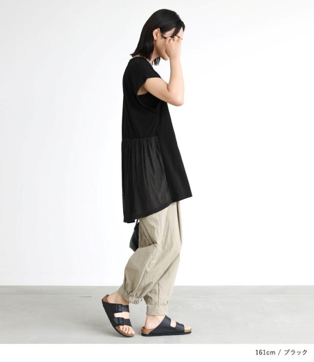 ■デザイン 後ろの切り替え部分にシアー感のあるラメカットソー生地を使用したプルオーバー。涼やかに着られるフレンチスリーブも嬉しいポイントです。長めの着丈でヒップ周りもお洒落にカバー◎ ■素材 本体はレーヨン混で落ち感のある、滑らかな肌触りのカットソー生地。少し透け感のある、柔らかなシアーラメカットソー生地をドッキングしました。 ■コーディネート シンプルなデニムやカジュアルなパンツと合わせるのがおすすめ。ネックレスなどのアクセサリーとの相性も良い、シンプルながらひとクセあるアイテムです。 |