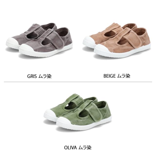 柔軟性のあるくたっとしたキャンバス生地を使用したシューズ。甲の部分はゴムになっていて、一人でも履きやすいベルクロタイプになっています。アウトソールは適度な弾力とグリップ力のある天然ゴムを使用し、滑りにくく履きやすくなっています。発色の良いカラーを使っているのが特徴です。シンプルなデザインなので、様々なコーディネートに合わせやすいシューズです。