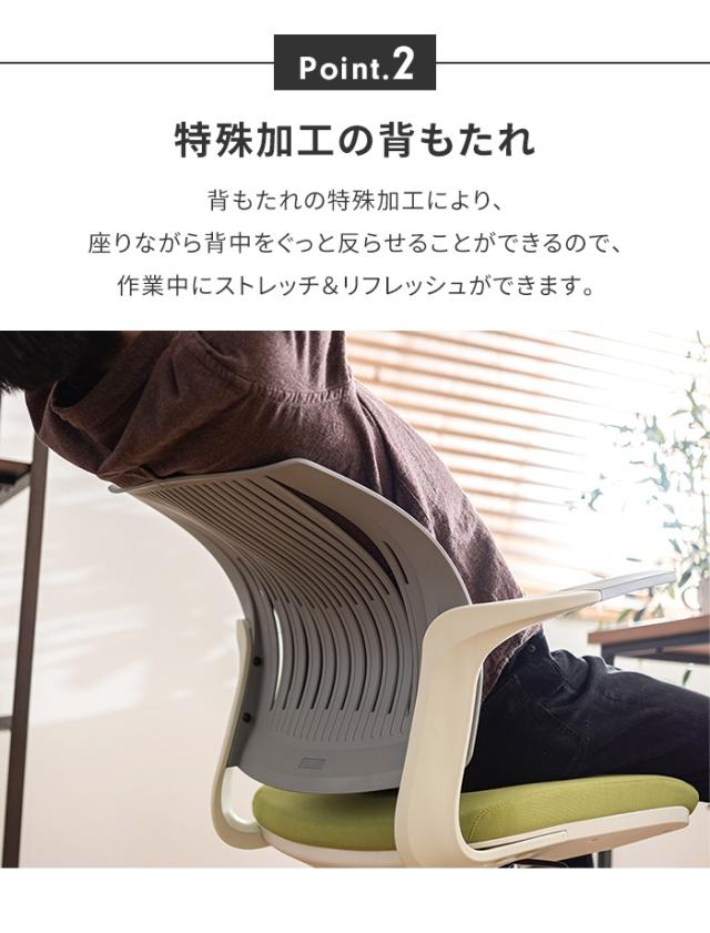 | 背もたれが背中に合わせて形状が変わるオフィスチェア。 座りながら背中をぐっと反らせるので作業中にリフレッシュできます。 |