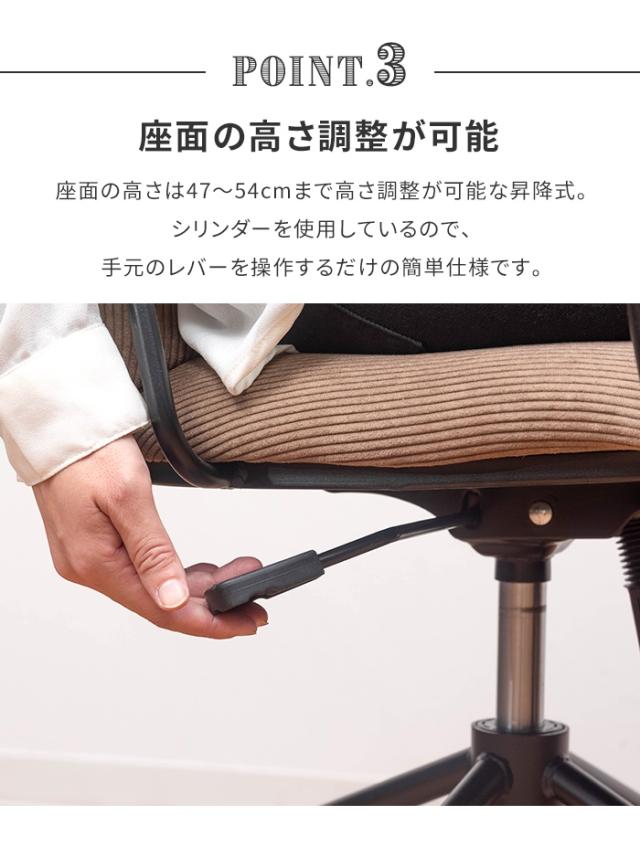 キーワード: チェア デスクチェア 椅子 おしゃれ キャスター付き 昇降機能 ロッキング機能 回転式 ヴィンテージ コーデュロイ かわいい オフィスチェア ダイニングチェア イス いす 腰掛け スチールフレーム クッション 頑丈 高さ調整 肘掛け付き シンプル ロッキング リビング ダイニング 書斎 オフィス