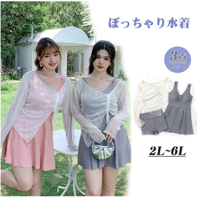 ワンピース水着 レディース mizugi 2点セット ぽっちゃり 大きいサイズ ブラック グレー 半袖 見せパン かわいい 体型カバー 女性 2L 5L 6L 海水浴 韓国風