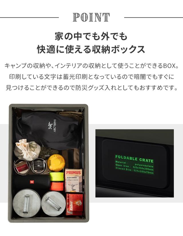 | 家の中でも外でも快適に使える収納ボックス。 キャンプの収納や、インテリアの収納として使うことができるフォルダブルクレート。 フタ付きなのでホコリなど汚れから守ることができます。 また、使わない時にはコンパクトに折りたたみも可能です。 印刷している文字は蓄光印刷となっているので暗闇でもすぐに見つけることができるので防災グッズ入れとしてもおすすめです。 |