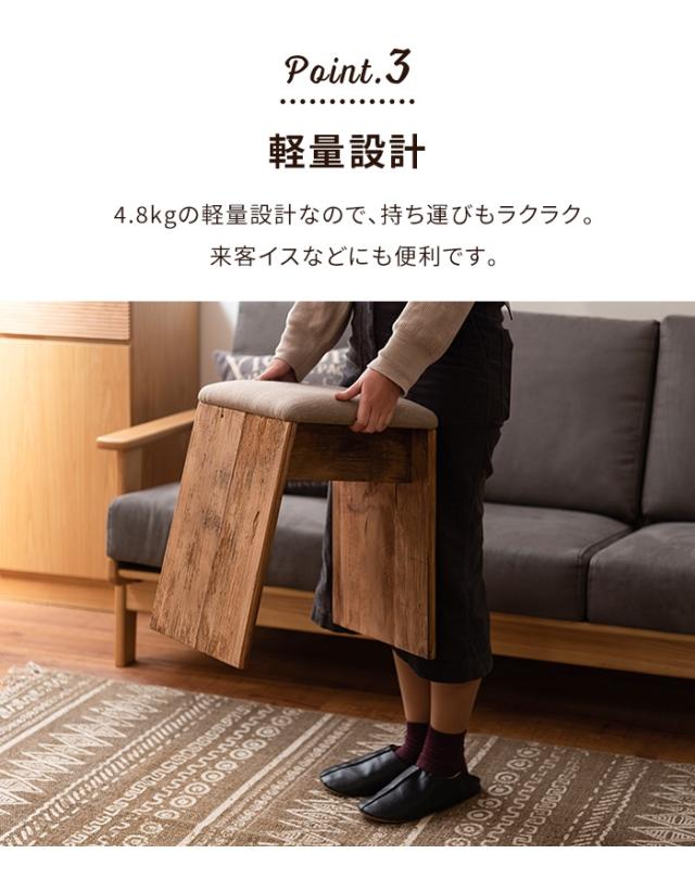 | ひとつひとつ表情の異なるパイン古材の質感とファブリック生地の組み合わせがおしゃれなスツール。 スツールとしてはもちろん、トレーなどを置いて簡易テーブルとしても◎ 軽量で持ち運びもラクラク。 |