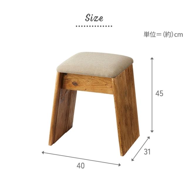 ひとつひとつ表情の異なるパイン古材の質感とファブリック生地の組み合わせがおしゃれなスツール。