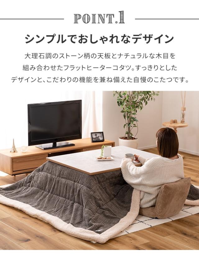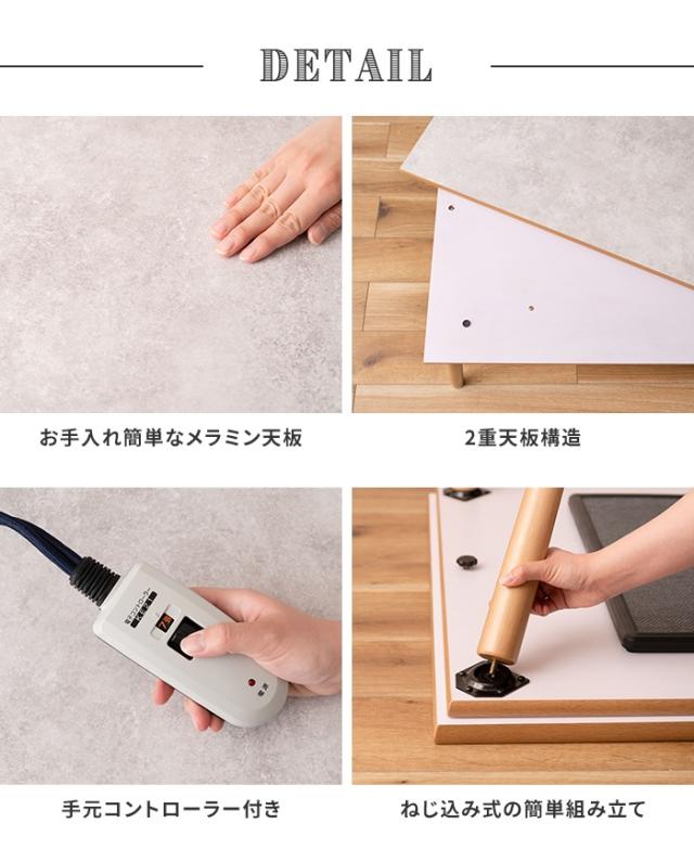| 大理石調のストーン柄の天板とナチュラルな木目の組み合わせ。 すっきりとしたデザインとこだわりの機能を兼ね備えた自慢のこたつです。 |