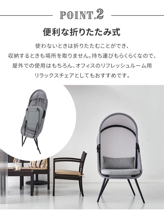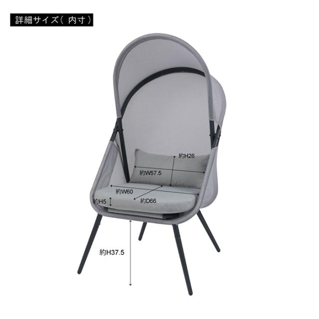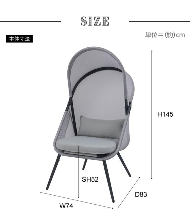 | モダンリゾート風の贅沢なルーフ付きのチェア。 落ち着いたカラーリングとシンプルなデザインでリゾートだけでなく、モダンな雰囲気にも良くあうチェア。 風を通すメッシュ素材の生地と日よけのルーフ付きで、屋外でも快適に使用出来ます。 メッシュ生地で圧迫感の無い開放的な仕様も魅力。 座面は非常にゆったりと座れるように設計。 高さもあるので、視界も妨げられずゆったりとくつろぎ時間を満喫。 ワンタッチで折りたたむことができるフォールディング(折りたたみ)仕様。 オフシーズンに収納がしやすく、場所を移動する際にも持ち運びに便利。 囲まれた仕様になっているので、自分だけの特別なプライベート空間に。 |