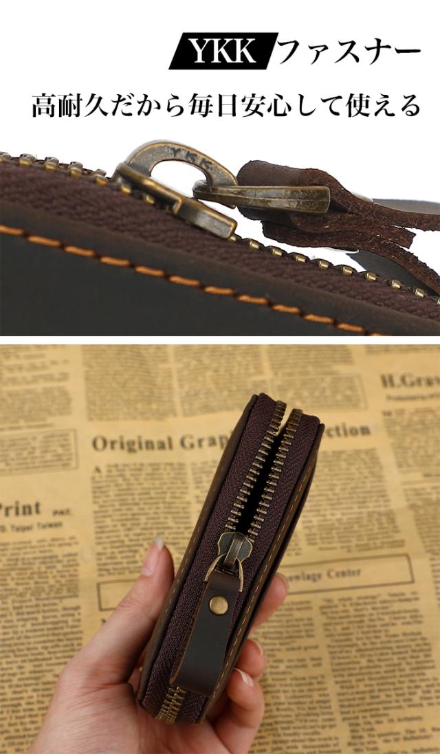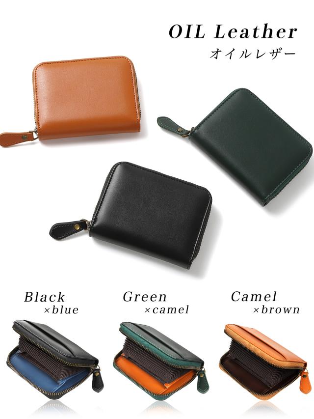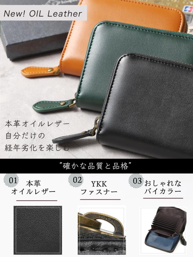 【本革 オイルレザー】インナー小銭入れのレザーがおしゃれなバイカラーで新誕生しました。中のカードポケットも11枚と多めに収納したい人にもおすすめです。ファスナーYKK、中RFIDスキミング防止機能付き。