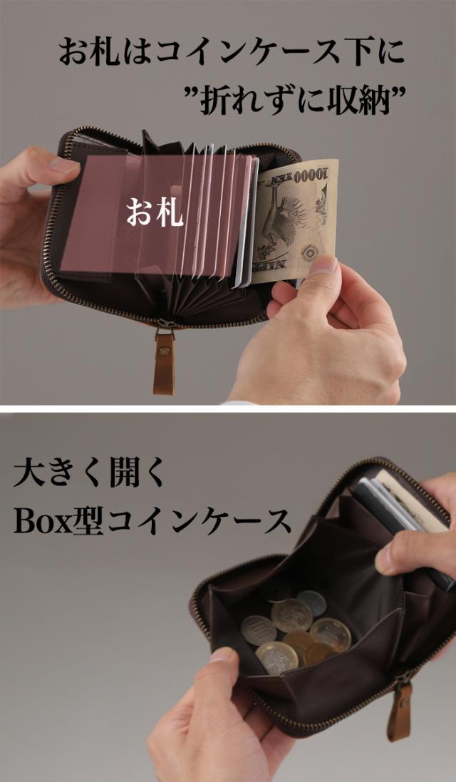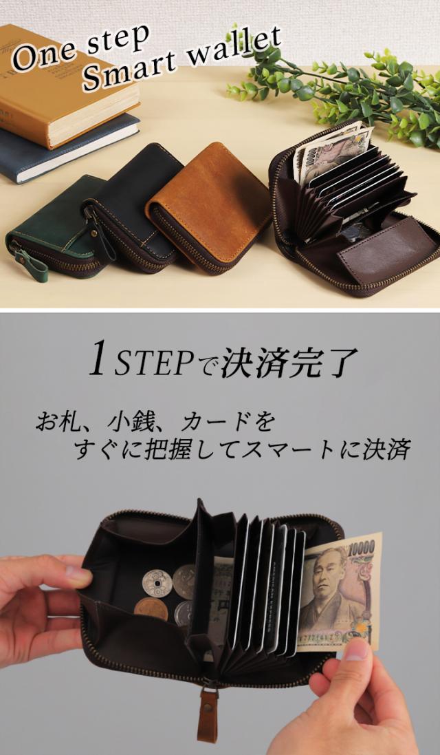 数量限定!アウトレットセールはこちら【1Step財布】ファスナーを開ければお札、カード、小銭の全てを瞬時に把握できるスマートウォレットです。お札は折れずに収納できる設計。小銭入れはファスナーやボタンなしでも中で溢れたりせず、Box型のためガバッと大きく開き中の小銭が出し入れしやすい設計。カードはじゃばらタイプなのですぐに欲しいカードが見つかります。