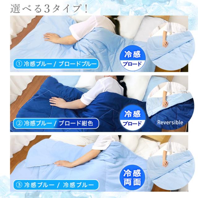 選べる3タイプ 【1.表:冷感ブルー / 裏:ブロードブルー】 【2.表:冷感ブルー / 裏:ブロード紺色】 【3.表:冷感ブルー / 裏:冷感ブルー】 ◆生地 表(冷感ブルー): ナイロン100% 【接触冷感 クール Q-MAX0.5】 裏(ブロード生地):ポリエステル100% 【制菌・抗菌・防臭・ニオイ対策】 ◆中綿 中空ポリエステル100% |