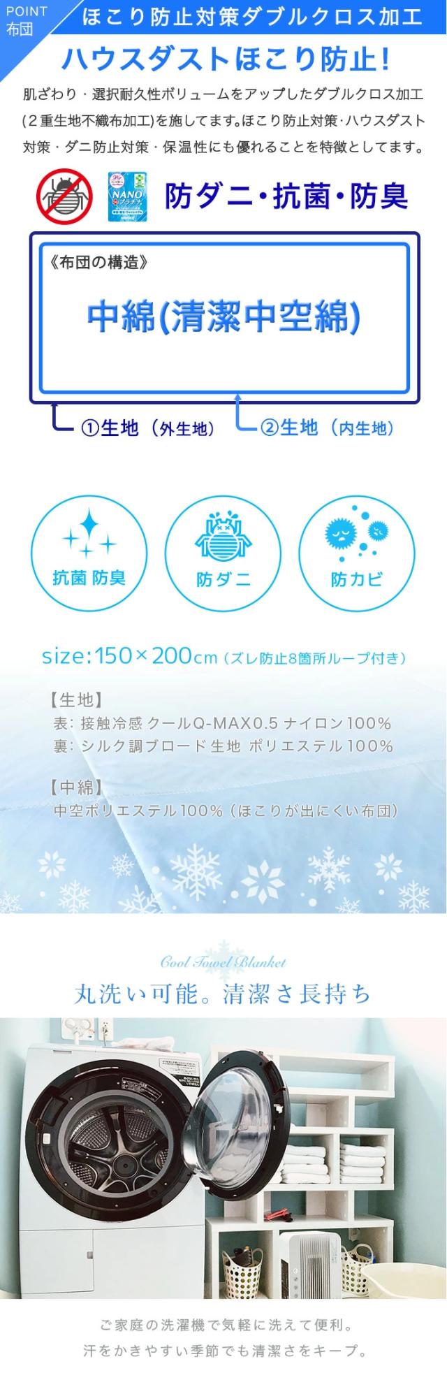 洗濯OK 接触冷感 肌掛け布団 【Clean Keep 清潔さ長持ち】 ダブルクロス加工を施し、ほこり防止・ハウスダスト対策しており、内生地には防ダニ・抗菌加工を施しています。 【備考】 ※接触冷感・吸水速乾・冷感クール掛け布団 ※クール Q-MAX0.5最大値!は2015年基準です ※ブロード面は接触冷感ではございませんのでご了承ください |