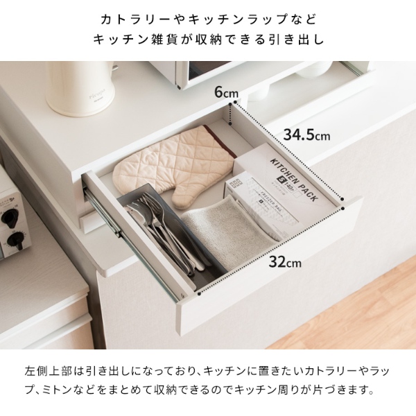 必要な時だけ引き出せる便利なスライドトレーで、使わないときも邪魔にならず、手狭なキッチンのお家やワンルームなど、一人暮らしの方にもオススメです。引き出し収納もありカトラリーやキッチン雑貨も収納できます。