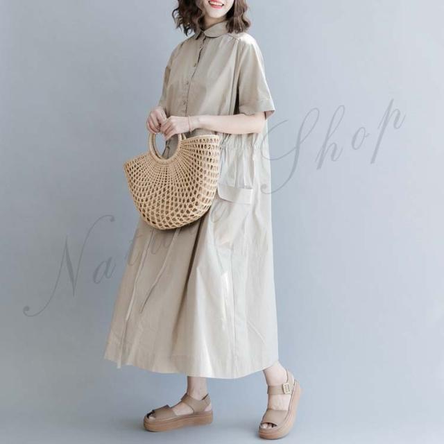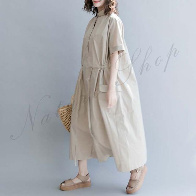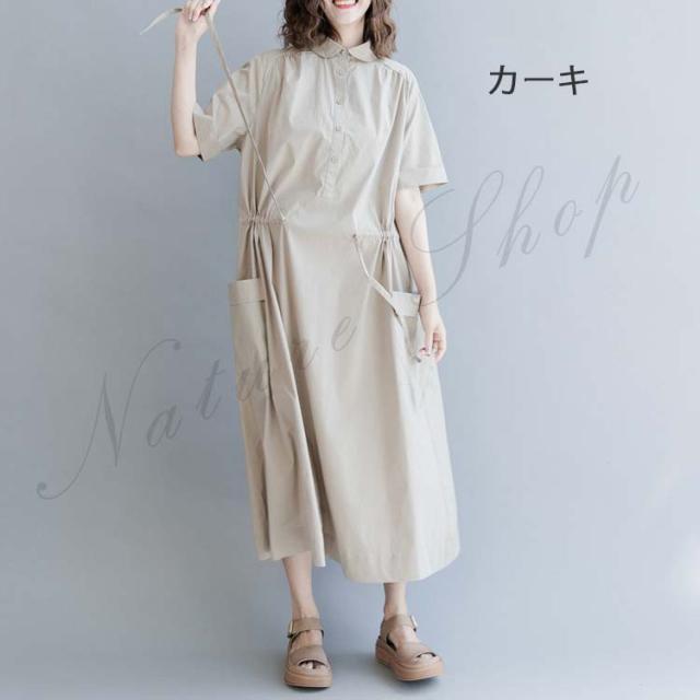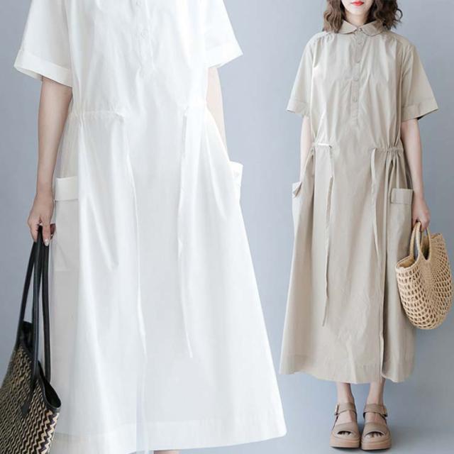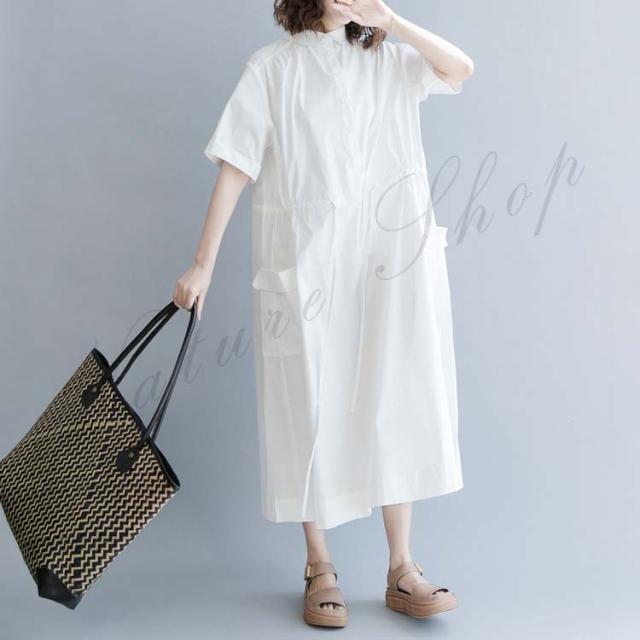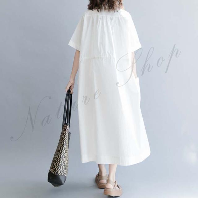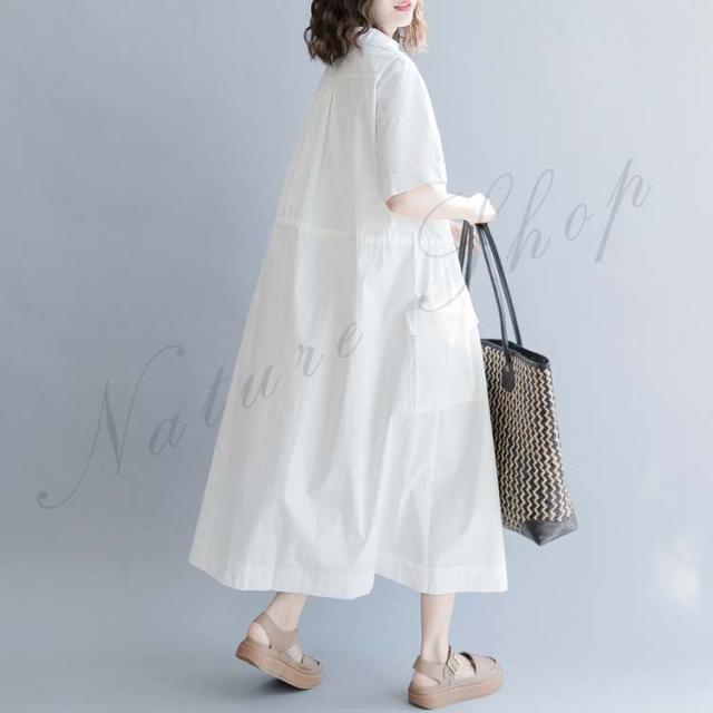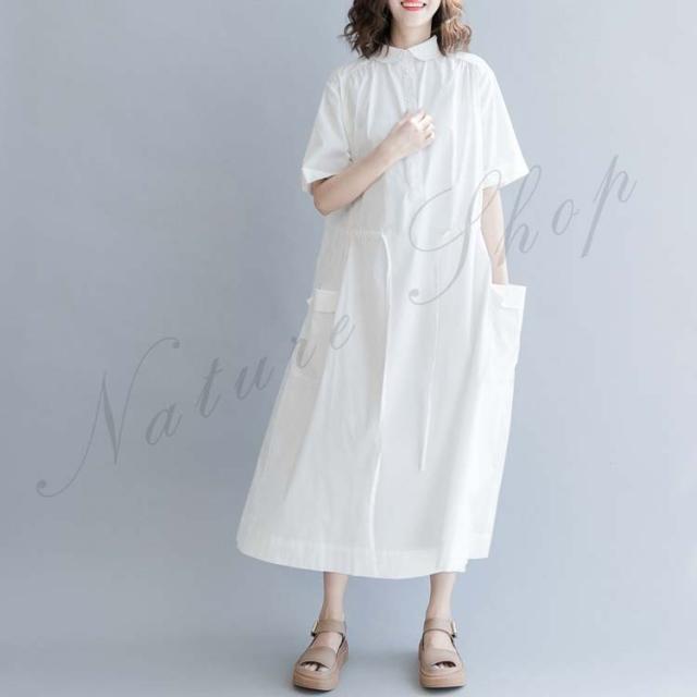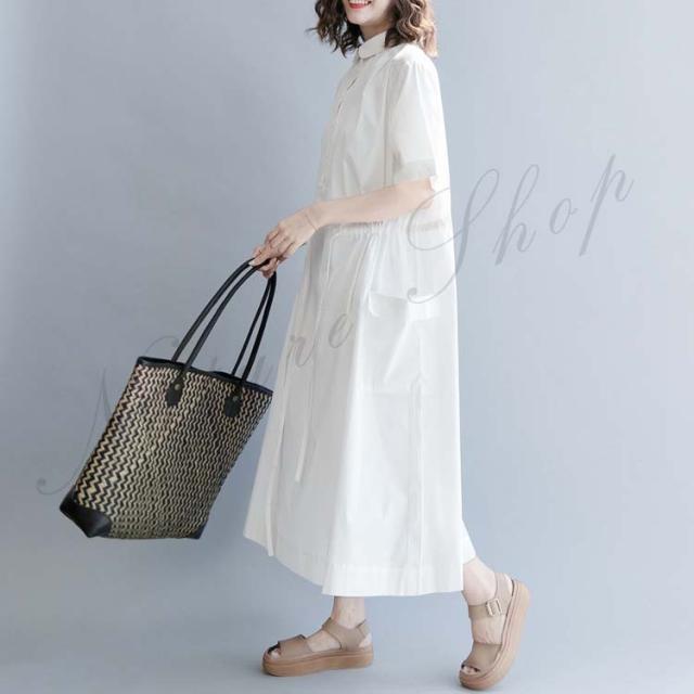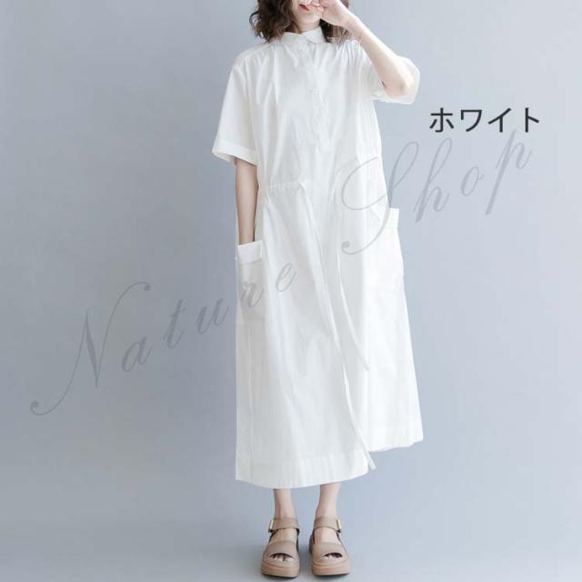 シャツワンピース 夏 ロング 白 半袖 きれいめ レディース 大きいサイズ ワンサイズ フリーサイズ 無地 腰締め 折り襟 綿麻 ワンピース 夏 レディース きれいめ 春夏 ドレス