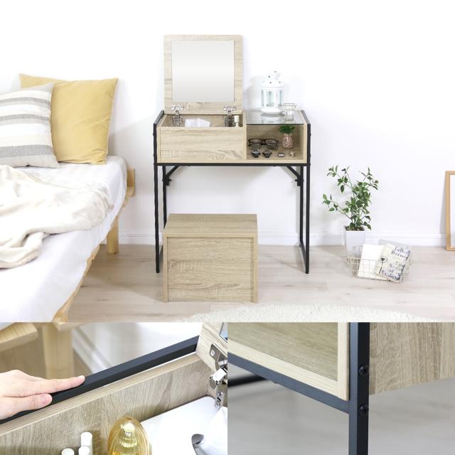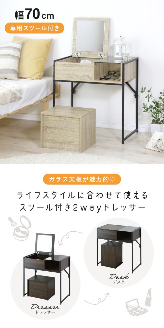 天板は幅70cmと十分なサイズ感があるので、デスクとして使用するときにパソコンや書類を広げても伸び伸び快適に作業できます。ドレッサーとして使うときは化粧品やアクセサリーをたくさん並べても余裕の広さです。専用のスツールはそれぞれの使用時にあった高さに設計されているためストレスなく快適にご使用いただけます。
