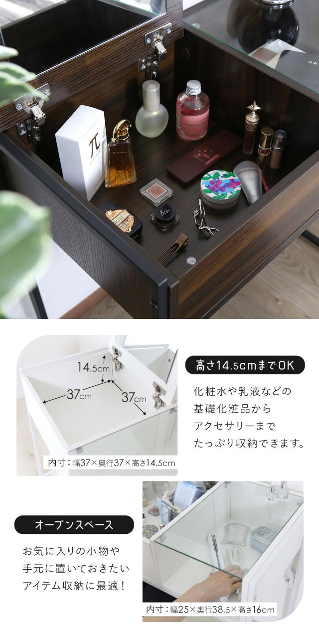 収納スペースも充実していて深さもしっかりあるので、ボトル状の化粧品やアクセサリーなどもたくさん収納できてきちんと整理整頓できます。ガラス天板の下はオープンな収納スペースになっているので、お気に入りのアイテムやちょっとした物置きにぴったり!