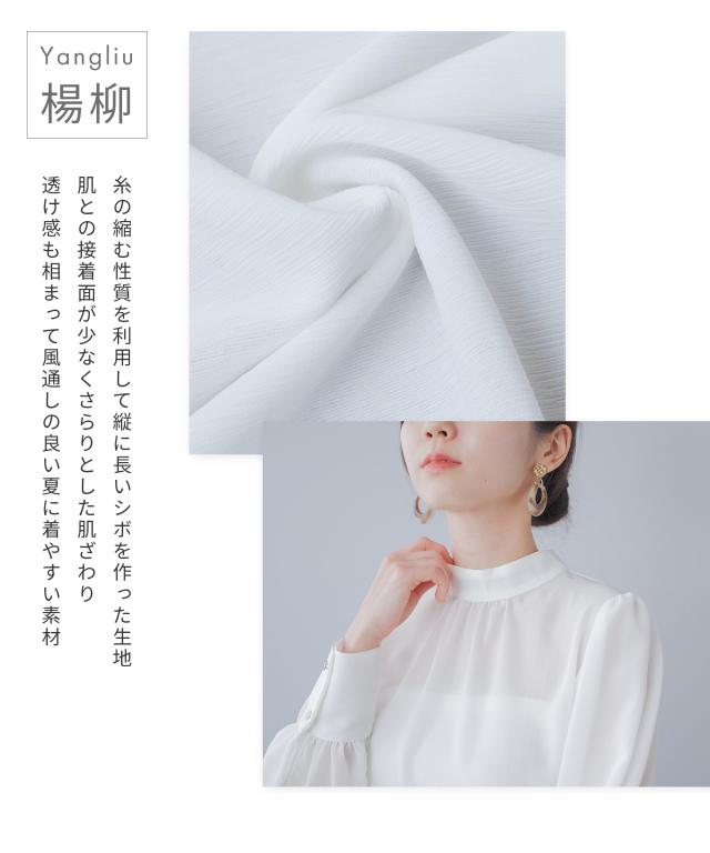 上品さを失わない透け感と程よいボリューム袖の楊柳ブラウス