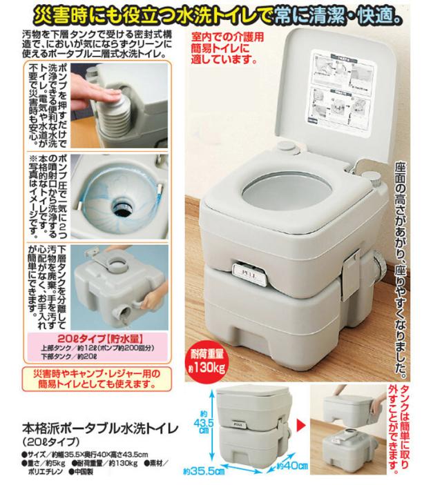 本格派ポータブル水洗トイレ 20Lタイプ 簡易トイレ 電気水道不要 災害 非常用 介護用 キャンプ レジャー 防災用品(代引不可)【送料無料】