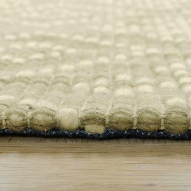 幾何学模様が特徴的な手織りのラグです。縦糸を大きくとった大胆な作りで白い糸が織りなす模様は、石目の様にも日本の小紋にも見える美しさがあります。洋室だけでなく、和室にも合わせやすい1枚です。
