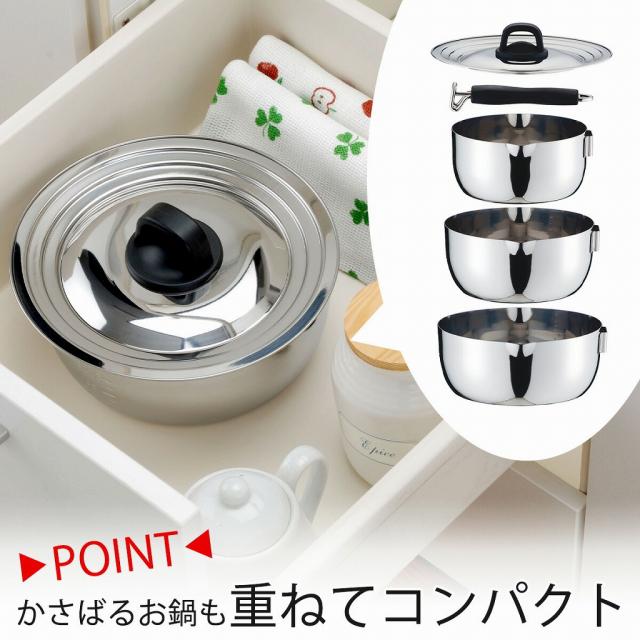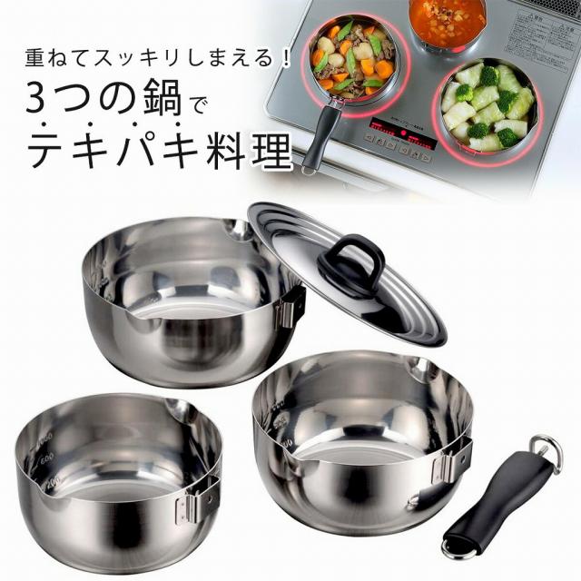![]() | 3つ鍋は重なって コンパクトに収納! 着脱式のハンドルと重なる鍋でコンパクトにまとまります。収納場所にも困りません。 |