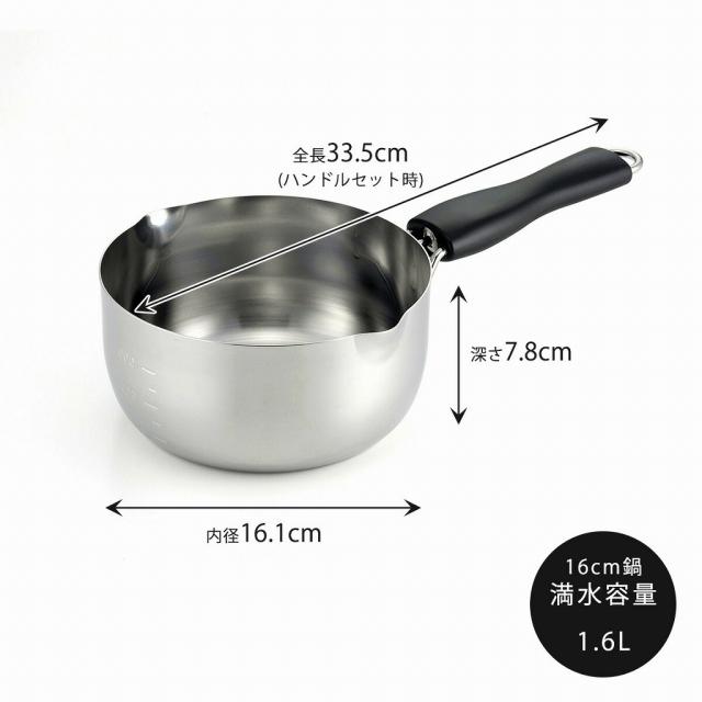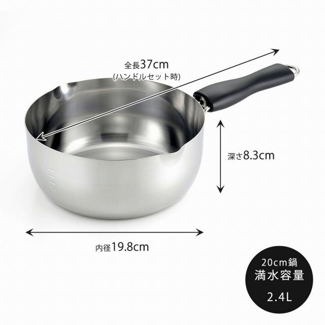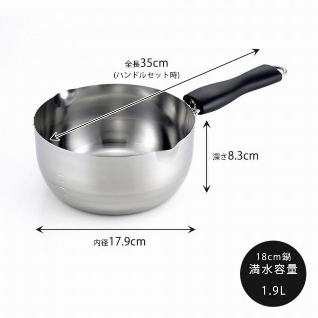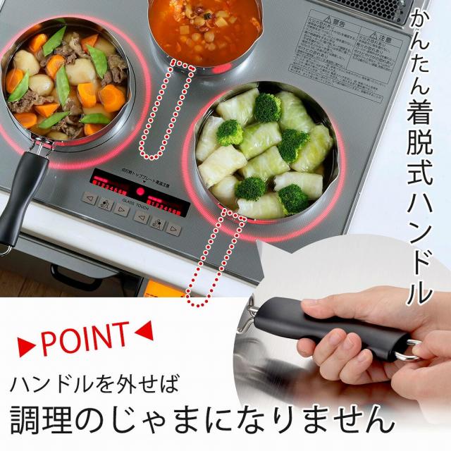 使用機会の多い16・18・20cmのセット。着脱式ハンドルなので収納にも場所をとりません。レバーを引いて引っ掛けるだけの簡単操作。料理の目安に便利な目盛りと、注ぎ口は両口付きです。