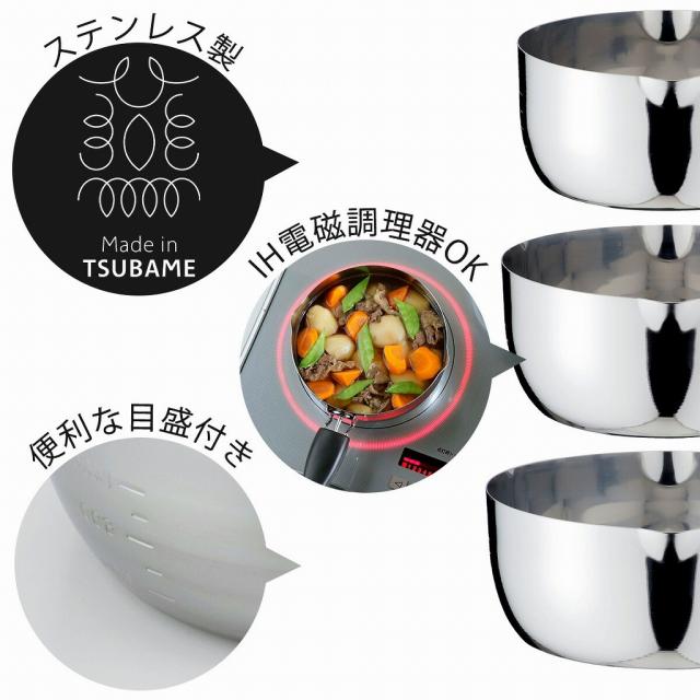 ピカピカに磨かれた ステンレス製 メイドインツバメ認証のステンレス製。付いた汚れもつるんと落ちてお手入れもかんたん。便利な目盛付き。 ガス火はもちろん、IH調理器にも使えます。 | ![]() |
