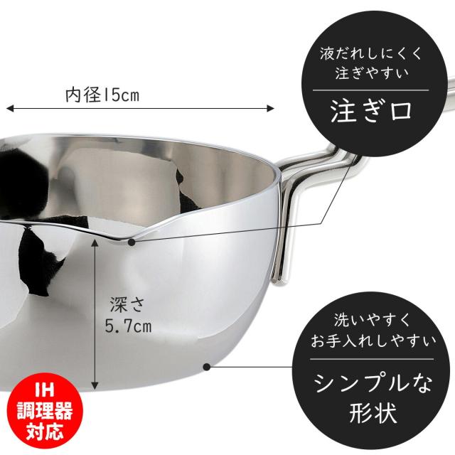 ![]() | 普段使いに使いやすい15cm 使いやすさは使って納得 ちょっとした茹で物から毎日のお汁作りも、サッと使えるコンパクトサイズが使いやすい。両側についた注ぎ口は注ぎやすく液だれもしにくい形状。外面も内面もピカピカのミラー仕上げで、付いた汚れも落としやすくお手入れもかんたん。高品質のジオ・プロダクトだから、使ってわかる自信のお鍋です。 ガス火はもちろん、IH電磁調理器対応。食洗器でも丸ごと洗えます。 |