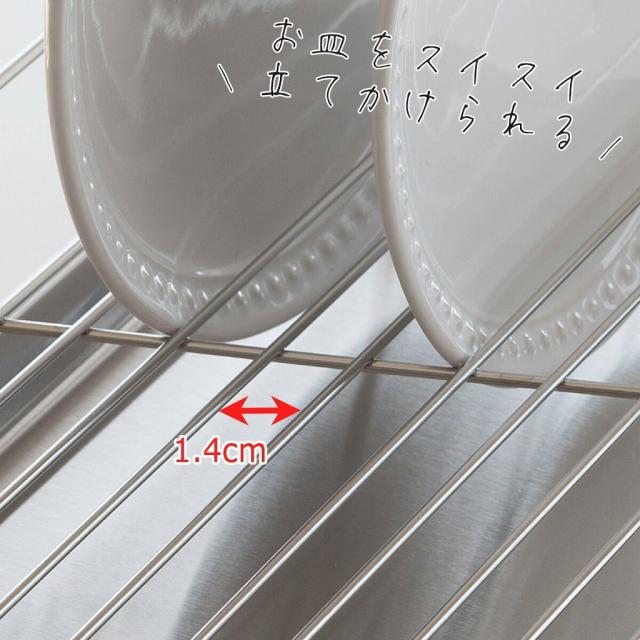 ![]() | スイスイと お皿を立てかけられる 線材間隔は約1.4cm。お皿がスイスイ立てかけやすい間隔にしました。できるだけ汚れの付着がないように線材の交差する部分を減らしたデザインです。小皿〜大皿をピタッと立てて水切り!立てられるから水切れも早い。 |