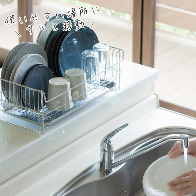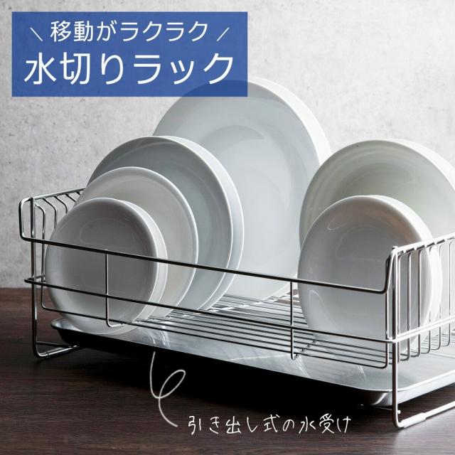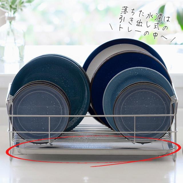 引き出し式トレーで 好きな場所に移動できる ラックの下にスライドしてセットするトレーが水をしっかり受け止めます。使うときにシンク脇に置いて、水切りが終わったらシンク奥にらくらく移動。持ち運びもしやすい形状です。 | ![]() |