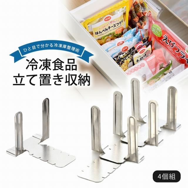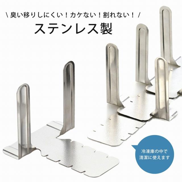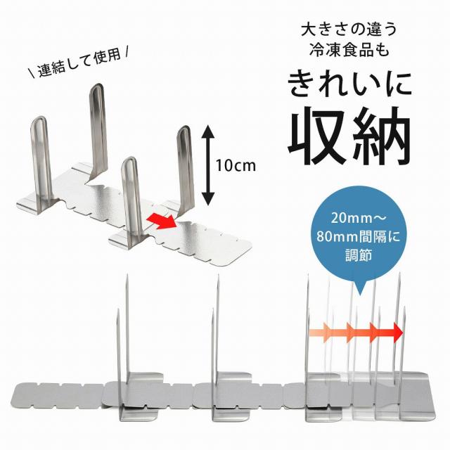 重なってごちゃごちゃのフリーザー内、何の冷凍食品か?分かりにくく取り出しにくいを解消。立てて冷凍食品を収納できるから、探しやすく取り出しやすい。整理整頓できるからスペースを有効に利用でき、よりたくさんの冷凍食品が収納できます。2〜8cmまでの4段階に幅を変えられます。ステンレス製なので臭い移りが少なく経年劣化による破損がありません。高さ10cmなので浅めの冷凍庫でも使えます。