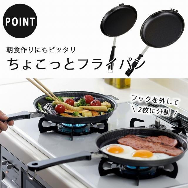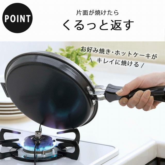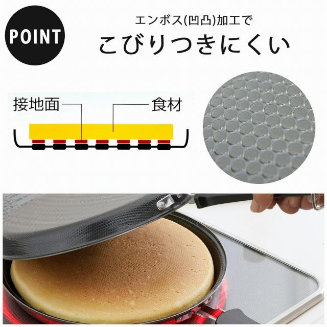 はさんでくるっと返すだけ!お好み焼きがきれいに焼けます。ホットケーキ・クレープ作りにも。フックを外すと2枚のフライパンに。表面に無数の凹凸を浮き立たせた特殊加工(エンボス加工)で、内面に油が回りやすく焦げつきにくいです。IH調理器に対応。丈夫なつくりで耐久性に優れています。※使い初めから油がなじむまでの間はこびりつくことがあります。