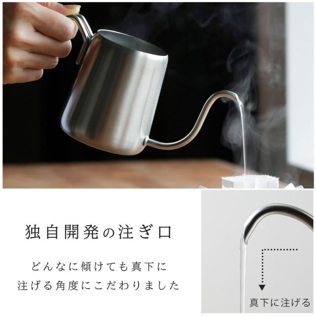 狙ったところにドリップできるポット!どんなに傾けてもほぼ垂直に注げる!こだわりの注ぎ口角度。極細口で一滴湯量に調整可能。