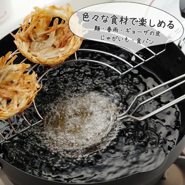 食材をはさんで揚げるだけ! アミ部に好きな食材をはさんで準備OK!持ち手についているリングを下げればしっかりと固定。あとはそのまま揚げるだけ! | ![]() |