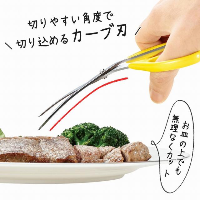 ![]() | お皿の上でらくらくカット! ハサミの刃部はカーブを描いた形状。出来上がったお料理も、お皿の上で無理のない角度でカットすることができます。肉料理もしっかり切れる切れ味です。 |