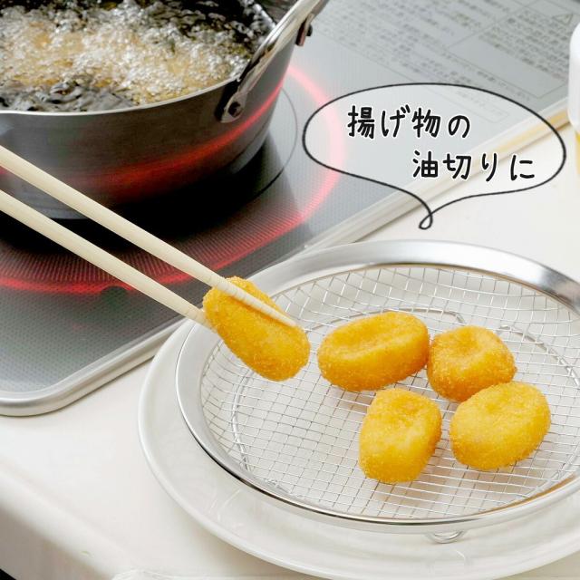 水・油切れが早い!アミ目を大きくすることで、サッと水・油が切れます。から揚げなども直接油切りに、そのままお皿にのせてテーブル上に。底が浮くことで余熱でベチャっとなりにくい!食パンも、カラッと焼き上がりをそのままに!溶接アミを使用し、スポンジが引っ掛かりにくく油汚れもスッキリ落ちます。野菜の水切りザルにも!