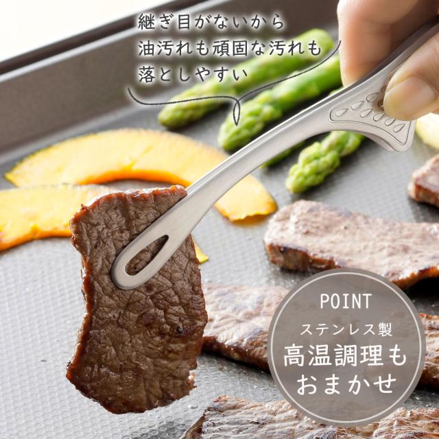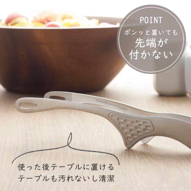 先端がしならず薄いので、重なってくっついた食材を剥がしやすく、つかみやすい。先端の内側は滑りにくいギザ加工。先端に穴があることで丸い梅干しやプチトマトなどがつかみやすいので、テーブルで漬物やサラダの取り分けにも。脚付きなのでテーブルに置いても先端が付かず衛生的。継ぎ目がないので洗いやすく清潔。