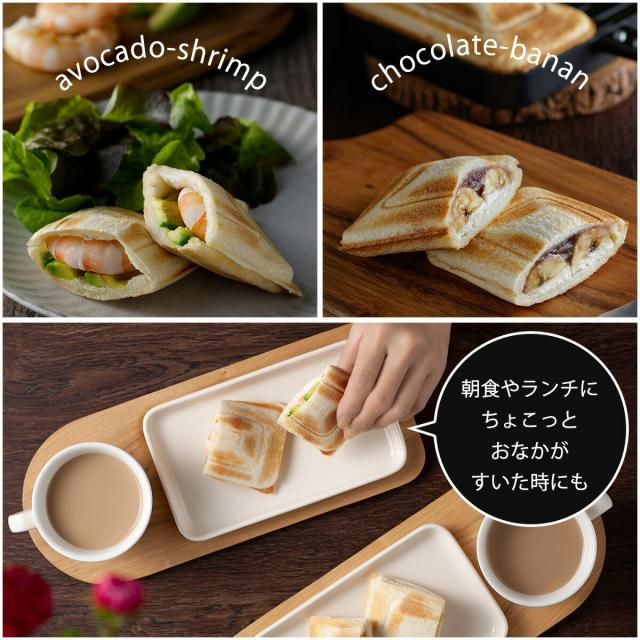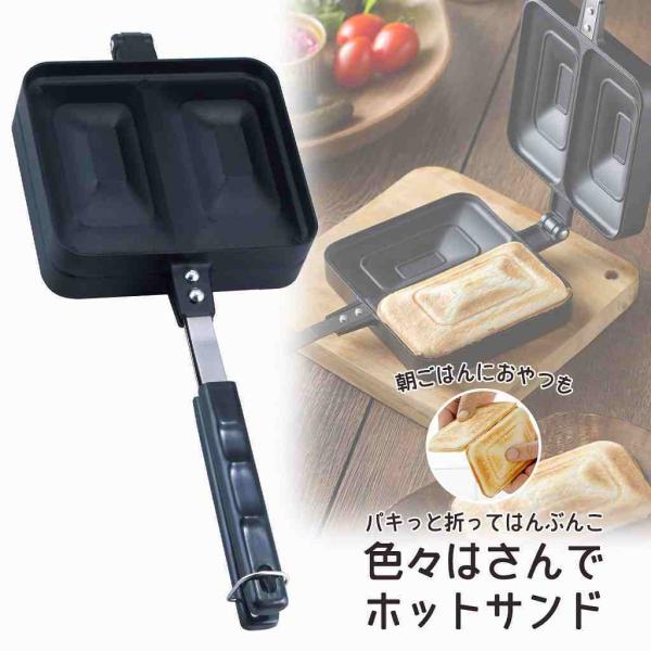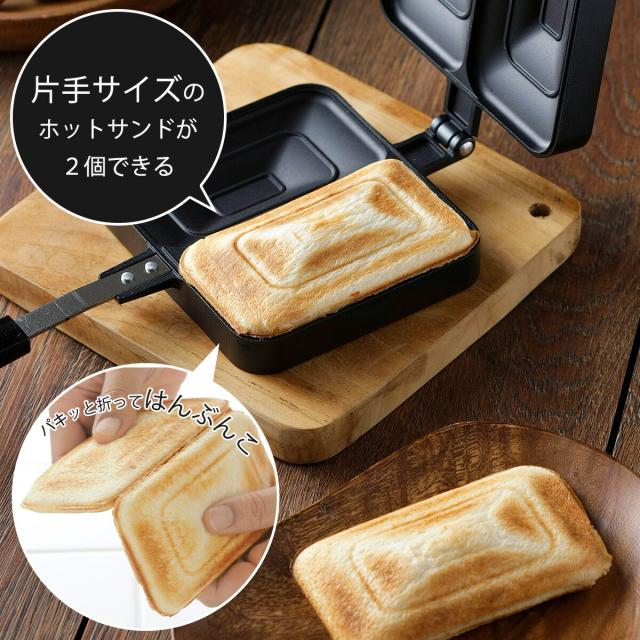 を防ぐブラックシリコン塗装仕上げ。6枚切の食パンにハムや野菜などのお好みの具を入れてプレス焼き。アツアツ・パリパリのホットサンドができます。